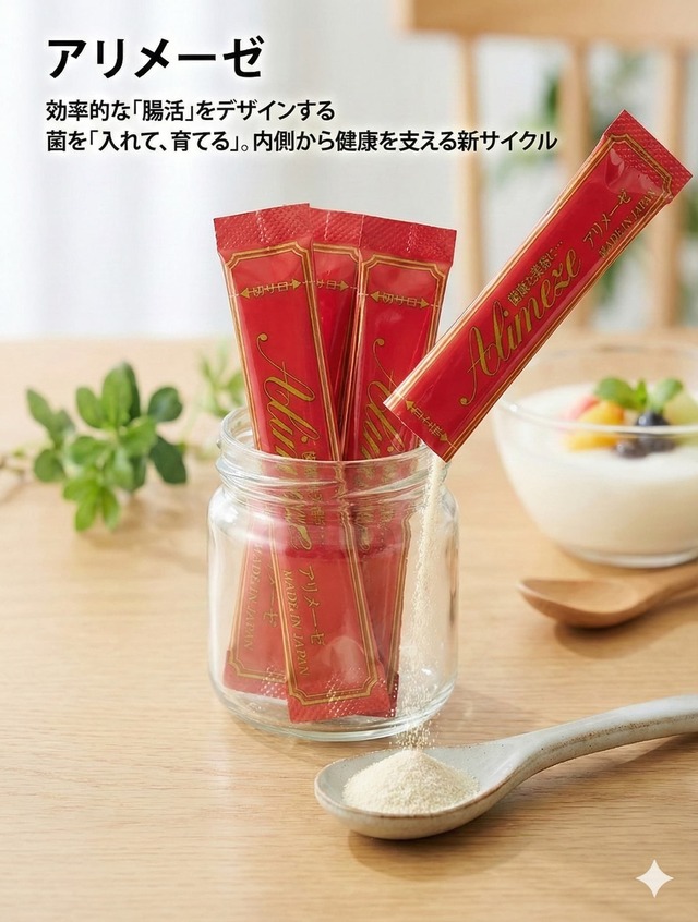 ■健康の土台は、お腹から 「なんとなく身体が重い」「スッキリしない日が増えた」「季節の変わり目にリズムを崩しやすい」……。 現代社会で忙しく過ごす中で、こうしたサインを見過ごしていませんか? 当ショップでは、「健康の基本は、まずお腹の調子を整えることにある」と考えています。 私たちの健やかな毎日の土台は、内側からつくられるもの。 だからこそ、日々のコンディションを支える「内側」に目を向けることが、何よりも大切だと確信しています。 そんな想いから、数ある健康食品の中から自信を持ってご紹介するのが、この『アリメーゼ』です。 ■ 乳酸菌のプロによる「こだわりの設計」 アリメーゼは、乳酸菌の製造を専門とする株式会社日本生菌研究所が、その知見を結集して開発した一品です。 単一の菌を摂るのではなく、小腸と大腸のそれぞれに届くよう、役割の異なる複数の菌を複合的に取り入れる「プロバイオティクス」の考え方に基づき、厳選された素材が1包に凝縮されています。 ■厳選した「7つの菌」の共演 お腹に有益な乳酸菌を補い、内側からのリズムを支えるための贅沢な配合です。 ・2種のビフィズス菌: 「BB536」と「BR-108」をダブル配合。 ・4種の注目乳酸菌: シールド乳酸菌®、クリスパタス菌、酒粕由来のK-2、そしてSNK12をバランスよくブレンド。 ・はぴねす乳酸菌: 毎日を前向きな気分で過ごしたい方をサポートします。 ■ 菌を届けるだけではない「シンバイオティクス」 アリメーゼは、菌の働きを助ける「エサ」となる成分も同時に摂取できる設計です。 ・ミルクオリゴ糖: 胃で分解されず、そのまま大腸の菌たちの元へ届きます。 ・パインファイバー(難消化性デキストリン): 善玉菌の栄養となり、スッキリとした毎日を内側から力強くバックアップします。 「健康への近道は、やはりお腹から。」 私たちが大切にしているこの信念を、確かな形にしてお届けしたい。 そんな想いから、小腸と大腸のそれぞれにダイレクトに届く菌を贅沢に配合したのが、この『アリメーゼ』です。 ■本当の意味で「自分をいたわりたい」と考えている方へ。 持ち運びに便利なスティック包装で、毎日続けたくなる美味しいフレーバーに仕上がっています。 お仕事の合間や旅行先でも、手軽に『腸活』を続けていただけます。 ■健康の土台を、今日から見直してみませんか? 当ショップが自信を持っておすすめする「アリメーゼ」が、あなたの健やかな毎日にお役立ちできれば幸いです。 ********** 【㈱日本生菌研究所】 http://www.nihonseikin.co.jp/ 【原材料】 難消化性デキストリン(国内製造)、ラクチュロース(乳成分を含む)、でん粉、乳酸菌末(殺菌)、ビフィズス菌末、植物性乳酸菌末(殺菌)、ビフィズス菌末(殺菌)、酸味料、香料 【内容量】 30g (1g ×30包) 【原産国】 日本
